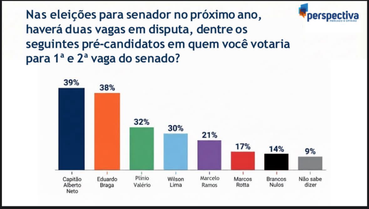 O deputado federal Capitão Alberto Neto (PL-AM) aparece na liderança da disputa por uma das vagas ao Senado Federal no Amazonas, segundo a mais recente Pesquisa Eleitoral Amazonas 2025, divulgada nesta quinta-feira (28) pelo Instituto Perspectiva Mercado e Opinião. O parlamentar soma 39% das intenções de voto, consolidando-se como um dos principais nomes do campo conservador no estado.