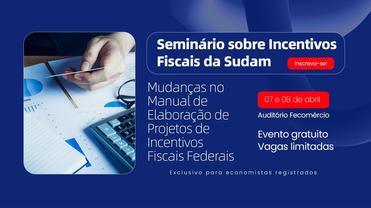 O Conselho Regional de Economia do Amazonas e Roraima (Corecon-AM/RR) realiza, nos dias 7 e 8 de abril, em Manaus, um seminário voltado às mudanças no Manual de Elaboração de Projetos de Incentivos Fiscais Federais. O evento, exclusivo para economistas registrados, será realizado no auditório da Fecomércio e conta com a parceria da Superintendência do Desenvolvimento da Amazônia (Sudam), do Conselho Regional de Administração do Amazonas (CRA-AM) e do Conselho Regional de Contabilidade do Amazonas (CRC-AM).