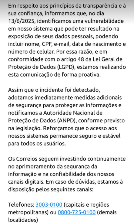 Os Correios dispararam nesta quarta-feira (25) mensagens para usuários dos serviços oferecidos pela empresa pública na qual alertam sobre o vazamento de dados pessoais, como Cadastro de Pessoas Físicas (CPF), e-mail, data de nascimento e número de celular.