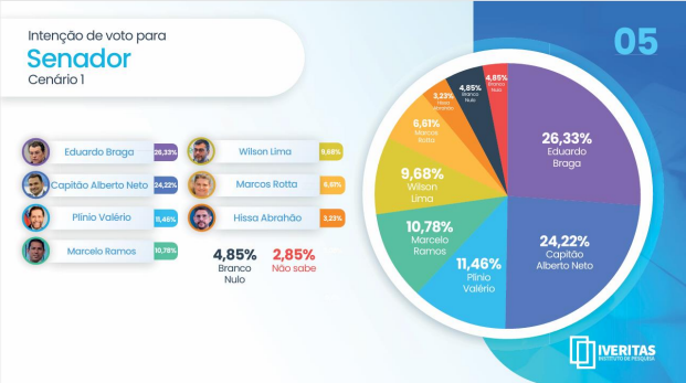 A pesquisa do Instituto Iveritas indica um cenário definido na disputa pelas duas vagas ao Senado Federal no Amazonas. Levantamento realizado entre os dias 3 e 17 de dezembro, em nove municípios do estado, mostra Eduardo Braga e Capitão Alberto Neto isolados na liderança, com ampla vantagem em relação aos demais concorrentes. A pesquisa ouviu 3.935 eleitores em Manaus, Iranduba, Manacapuru, Presidente Figueiredo, Rio Preto da Eva, Itacoatiara, Parintins, Coari e Tefé.