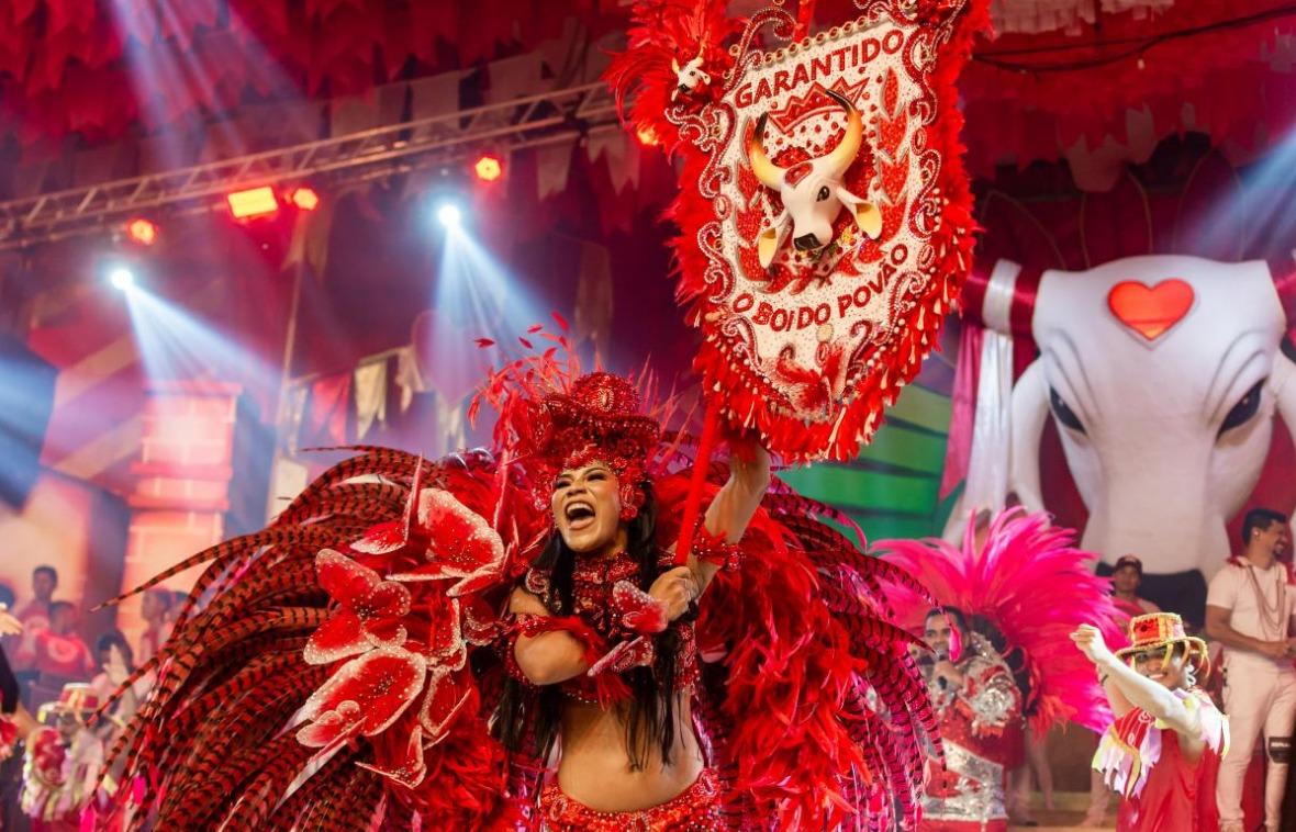 A nova porta-estandarte do Boi Garantido, Jeveny Mendonça, fez sua primeira apresentação oficial no Bumbódromo de Parintins durante o último ensaio técnico aberto ao público, na noite deste domingo (23).
