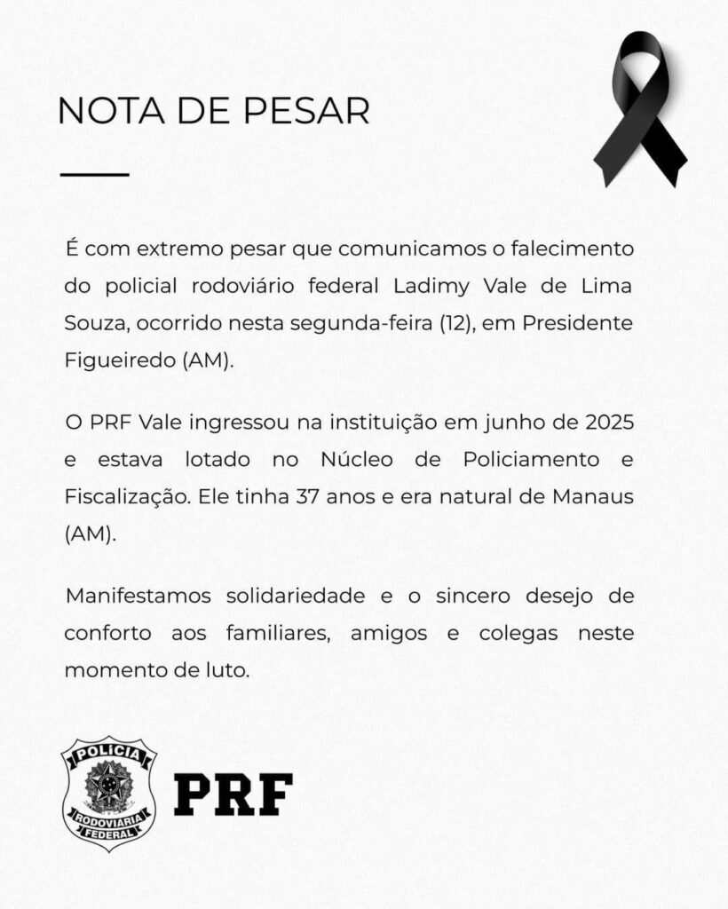 Em nota oficial, a PRF confirmou a morte do policial Ladimy Vale de Lima Souza, de 37 anos, ainda no local. Natural de Manaus, o agente havia ingressado na corporação em junho de 2025 e estava há menos de um ano na instituição, sendo lotado no Núcleo de Policiamento e Fiscalização da PRF no Amazonas.