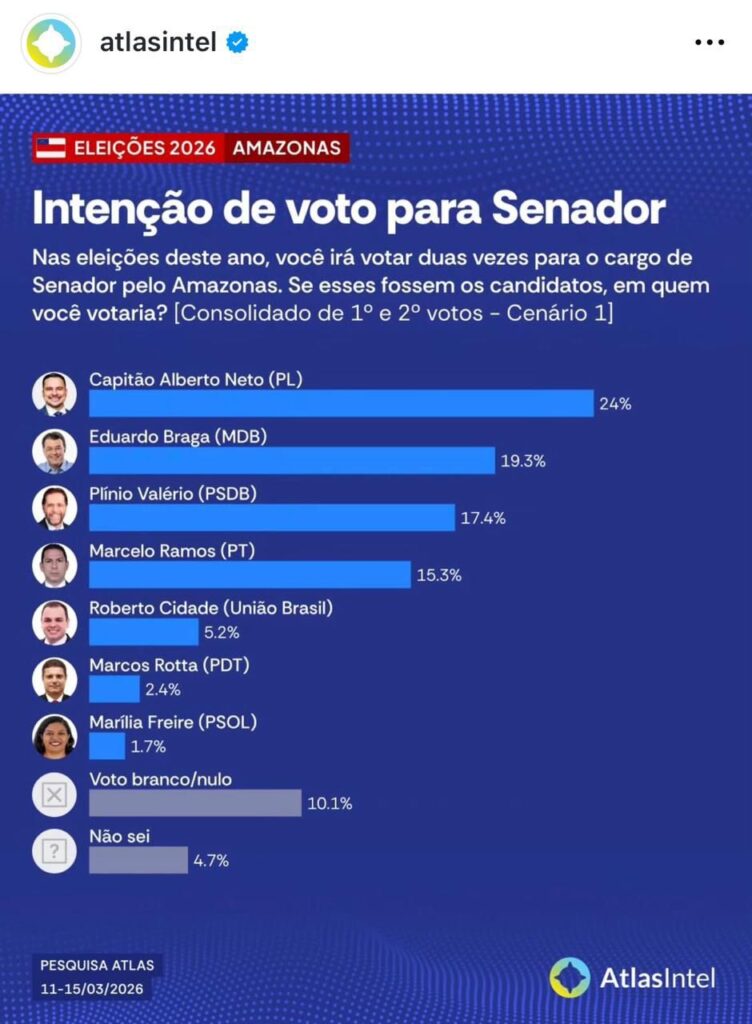A pesquisa AtlasIntel divulgada nesta quarta-feira, 18/03, indica liderança numérica do deputado federal Capitão Alberto Neto (PL-AM), na disputa pelo Senado Federal nas Eleições deste ano. No cenário unificado de 1º e 2º votos o parlamentar aprece com 24% de intenções de votos da população amazonense.