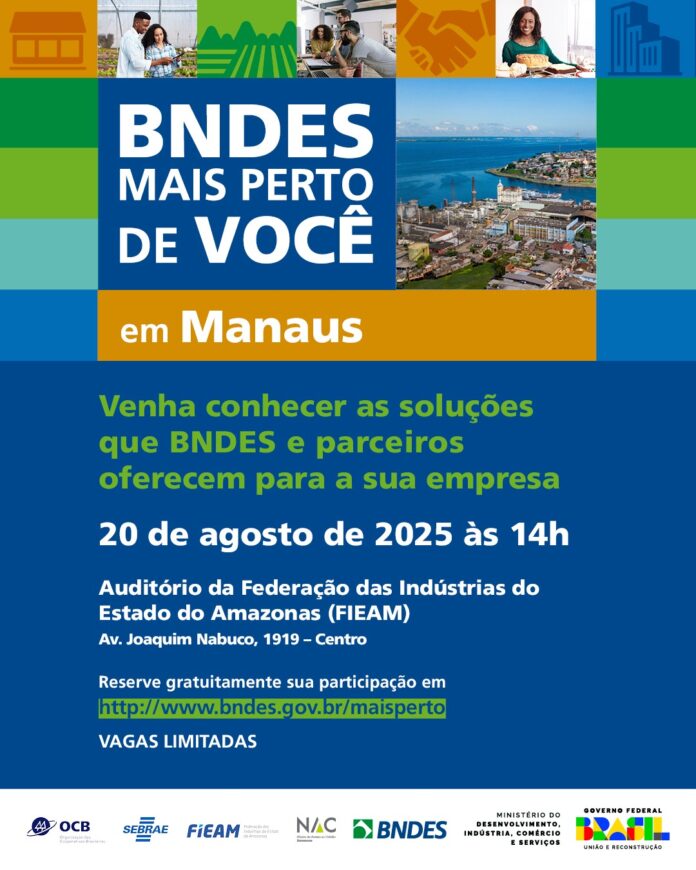 O Serviço de Apoio às Micro e Pequenas Empresas no Amazonas (Sebrae/AM) realiza, em parceria com o Banco Nacional de Desenvolvimento Econômico e Social (BNDES), o evento “BNDES Mais Perto de Você” na próxima quarta-feira, 20 de agosto, das 14h às 18h, na sede da Federação das Indústrias do Estado do Amazonas (FIEAM), localizada na Av. Joaquim Nabuco, 1919 – Centro.