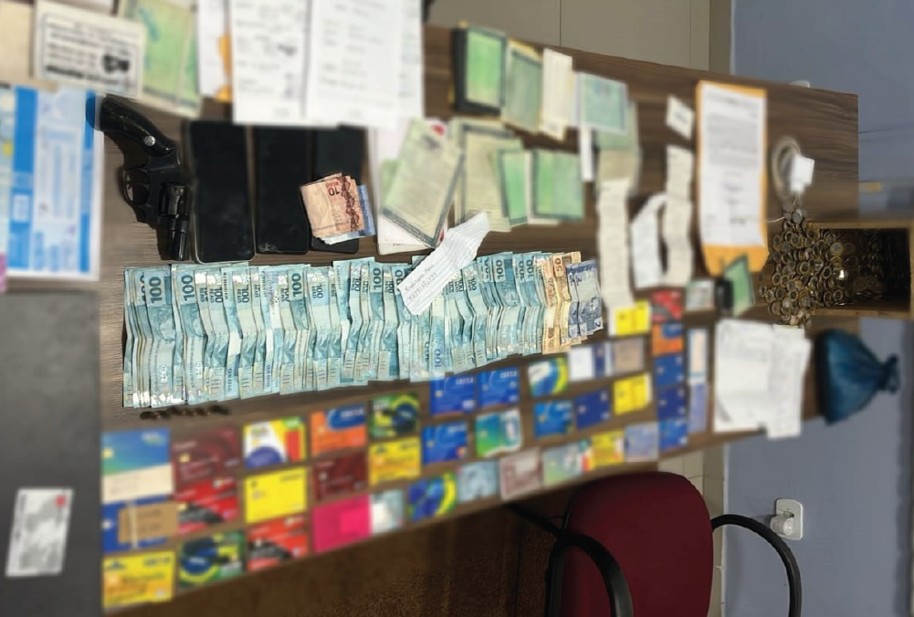 Durante a operação policial, foram apreendidos cerca de R$ 9 mil em espécie, uma arma de fogo, 45 cartões bancários e documentos de veículos retidos de vítimas.
